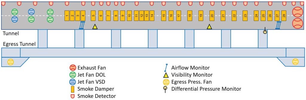 Two of the six fans will be controlled by variable speed drives to allow improved airflow control in emergency ventilation. This partly compensates the exhaust capacity not meeting the requirement of 192m³/s.
